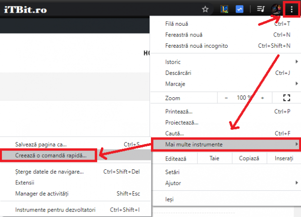 Deschidem Google Chrome dupa care mergem cu mouseul catre meniul din partea stanga-sus a ecranului, o data deschis meniul coboram putin mai jos si deschidem ” Mai multe instrumente “, iar acolo ne va astepta optiunea cautata ” Creeaza o comanda rapida “.