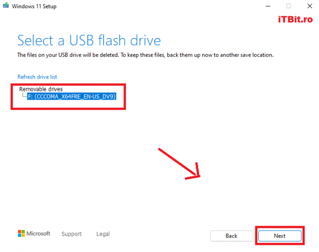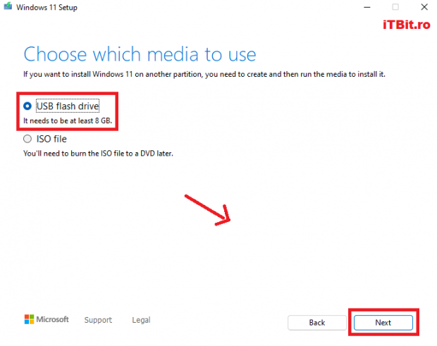 Pasul următor este să introducem un stick cu memorie de cel puţin 8 GB şi să bifăm modalitatea de instalare pe ” USB flash drive ” şi să apăsăm butonul next pentru a merge mai departe.