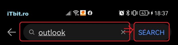 Pasul doi este să cautăm “aplicaţia” Outlook, acest lucru o facem prin tastarea numelui în caseta de căutare şi să apăsăm butonul ” Search “. sau ” Caută “.