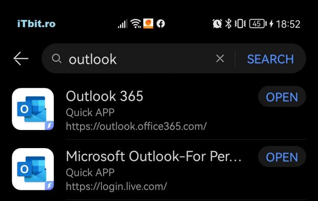 După ce am apăsat pe butonul ” Search ” mai jos apar rezultatele şi vom alege aplicaţia Outlook 365 sau Microsoft Outlook-For Personal care are specificaţia ” Quick App ” apăsând butonul ” Open “.