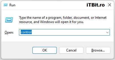 A doua metodă este să apăsăm combinaţia de taste ” Win ” + ” R ” care ne va deschide o fereastră unde o să tastăm ” control ” şi apăsăm butonul Enter sau apăsăm un click pe butonul Ok.