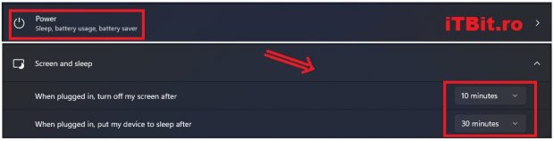 Ajunşi în setările de sistem ne uităm după meniul ” Power “, în care intrăm şi vom găsii meniul ” Screen and sleep ” pe care vom apăsa un simplu click pentru a ne prezenta setările pentru închiderea ecranului şi intrarea în modul de somn a PC-ului.