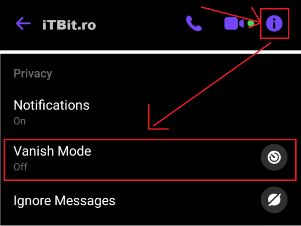 Pentru a activa opțiunea care curăță automat chat-ul trebuie să intrăm pe fiecare conversație în parte pentru a activa ștergerea automată a mesajelor, acest lucru se face prin simplul “Swipe in sus” ( Tragem cu degetul în sus până apare noua fereastră de chat ) sau apăsăm pe butonul ” i ” din colțul dreapta-sus a conversației și selectăm Vanish Mode pe ” On “.