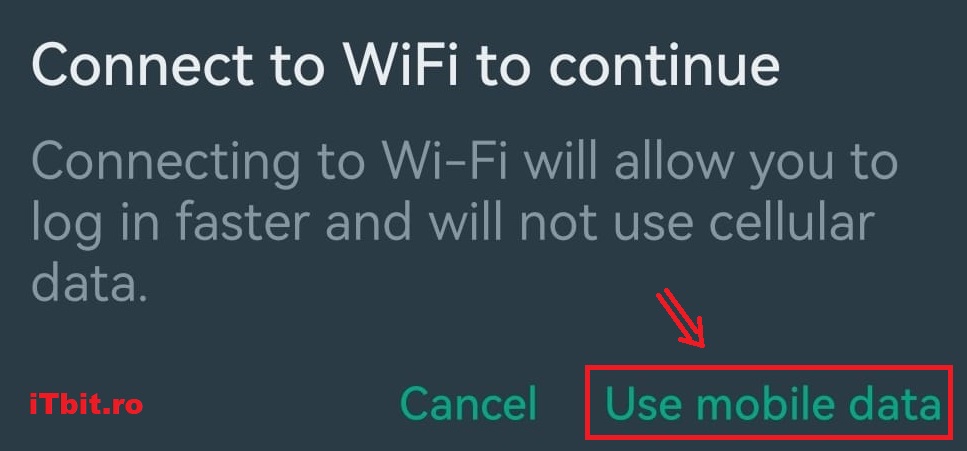 După ce am apăsat butonul ” Linked devices ” ne trimite să adăugam un dispozitiv apăsand butonul ” Link a device “, în caz că nu avem wi-fi vom fi întrebaţi dacă vrem să continuăm să folosim datele mobile, după ce confirmăm întreptăm camera telefonului catre ecran şi scanăm codul QR pentru a permite conectarea.