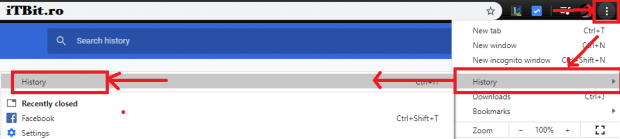 Prima metoda e cea grea, mergem frumos cu mouse-ul in partea dreapta-sus a ecranului unde se afla butonul de meniu, apasam un simplu click si coboram cu mouse-ul pe ” History ” sau ” Istoric “, depinde de limba in care avem setat browserul.