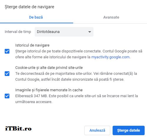 Apasam pe acest buton si bifam fiecare casuta in functie de ce dorim sa curatam in browser, fiind recomandat sa le bifam pe toate si sa apasam in final pe butonul albastru ” Sterge datele “.